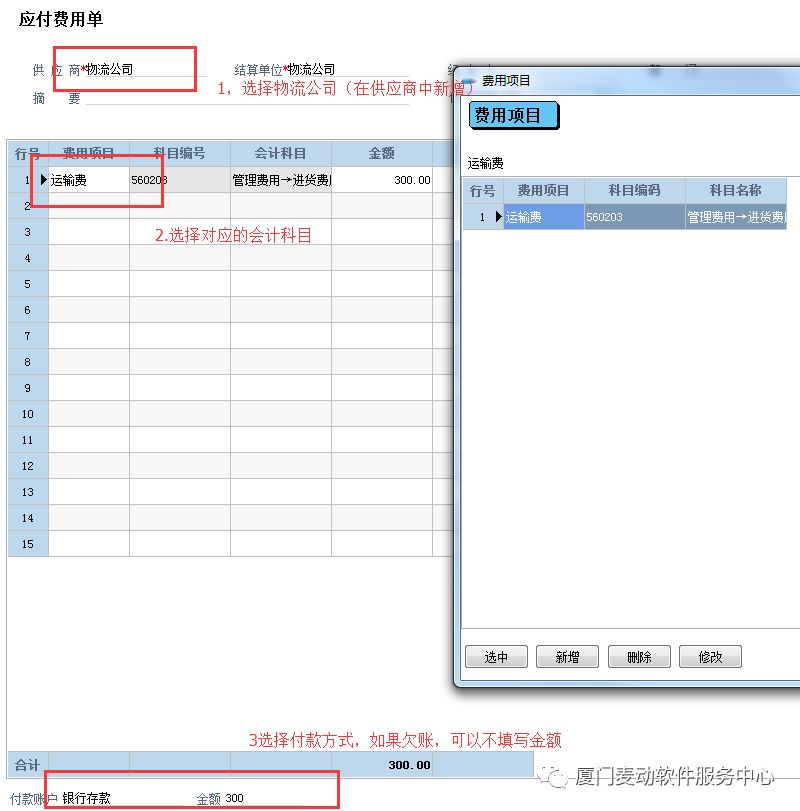 例如,我們此次進貨產生進貨運輸費用300,用銀行存款支付,在管家婆軟件中,制作應付費用單,如下圖