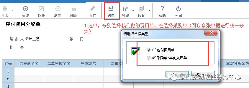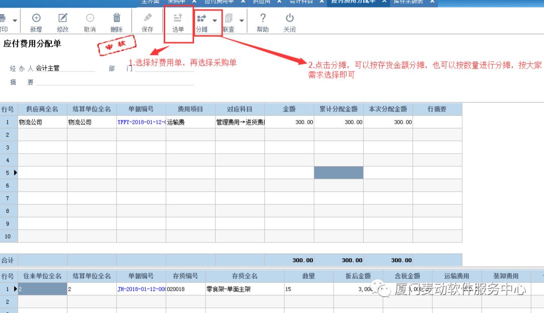 我們把費用單做好了,要將費用分攤進我們的采購單,進而影響成本價。那么我們點開采購管理-應付費用分配單,進行分配費用