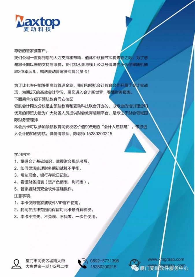 尊敬的管家婆客戶: 我們公司一直得到您的大力支持和幫助,值此中秋佳節(jié)即將來臨之際,為了感謝大家長(zhǎng)期以來的支持與…